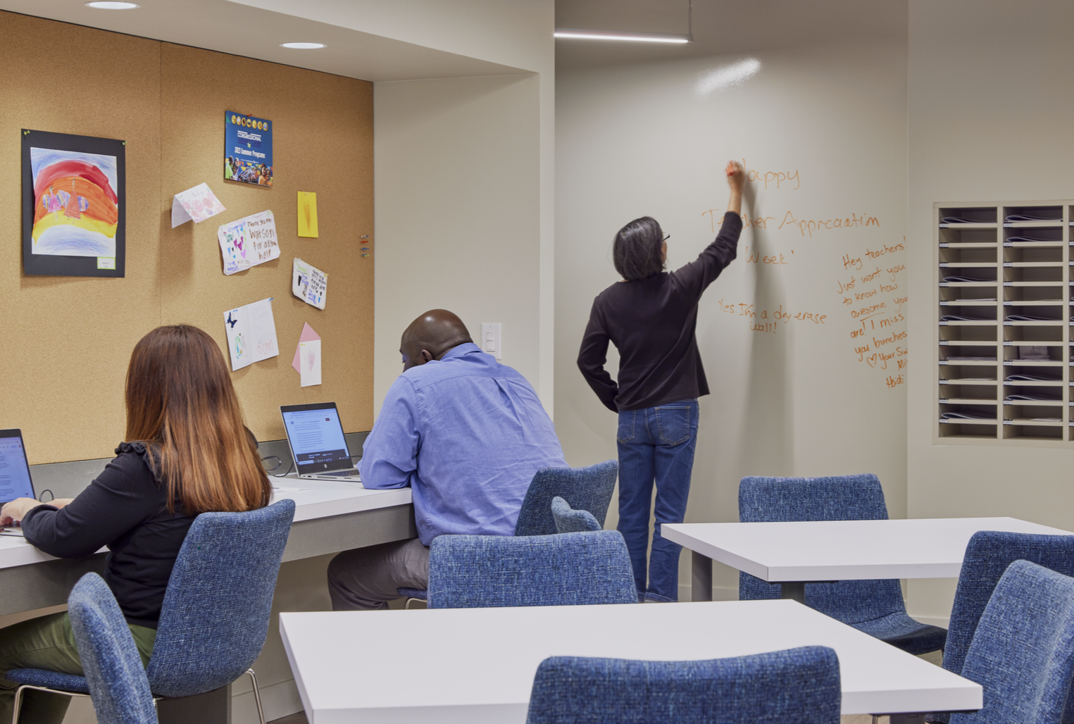 Following an HVAC replacement project, OB&K had the opportunity to transform the old boiler room into a flexible and productive place for the teachers. The space offers accommodations for dining, meeting, collaboration, individual work, mail, and a sound-isolated phone booth for sensitive calls.
