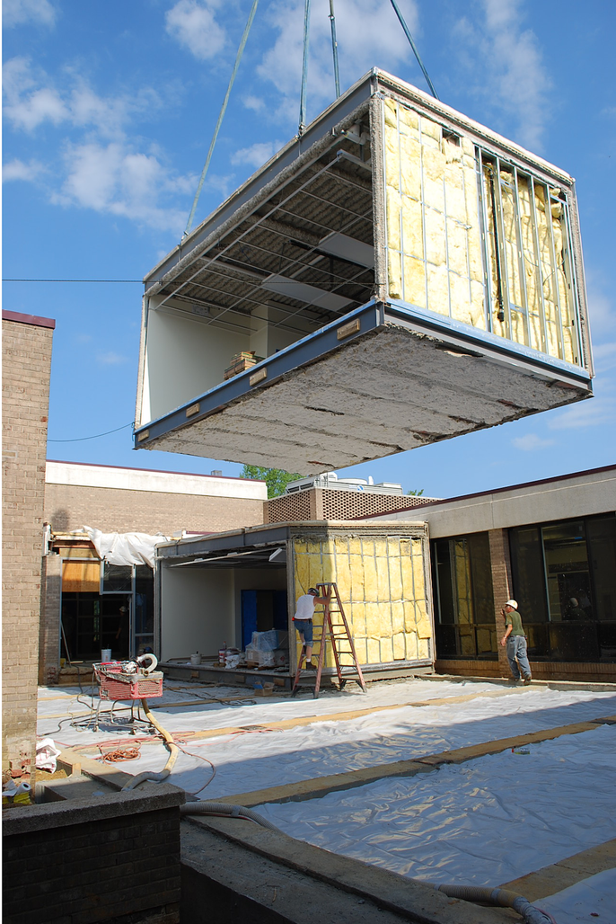 Permanent prefabricated classroom modules answered the question of how the project could get completed over the summer recess. The high performance LEED-silver equivalent design included phenolic rainscreen panels.